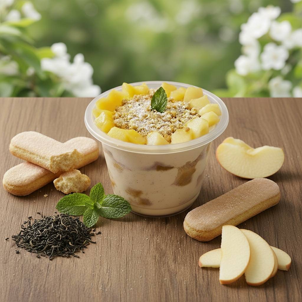 我們將香醇的伯爵茶葉融入馬斯卡邦起司與法國鮮奶油,再疊上酥脆的杏仁脆和手指餅乾,最後淋上濃郁的焦糖醬與新鮮蘋果丁。 每一口,都是伯爵茶的優雅、焦糖的香甜,以及蘋果的清爽,交織成最幸福的滋味。